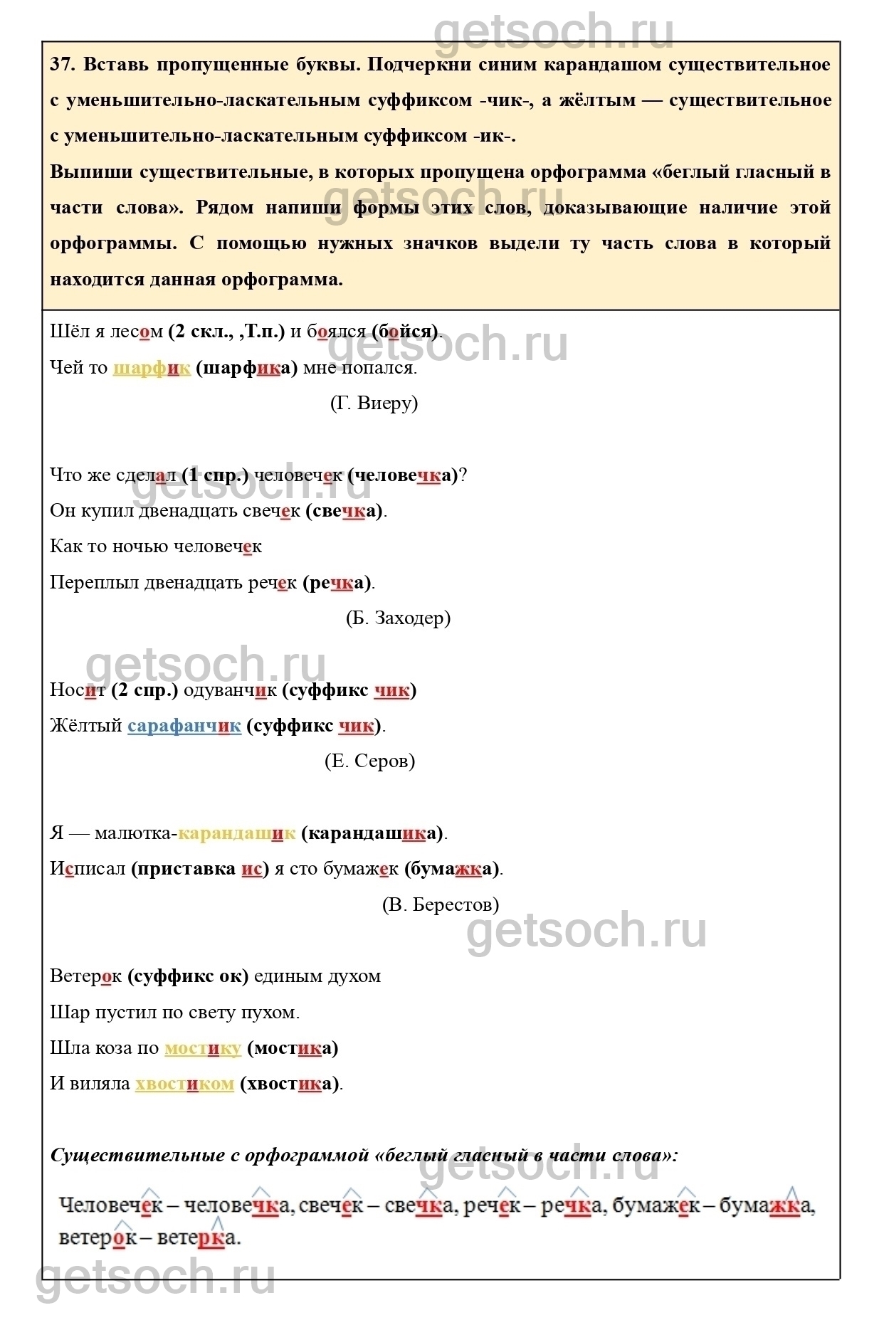 37. Вставь пропущенные буквы. Подчеркни синим карандашом существительное с уменьшительно-ласкательным суффиксом -чик-, а жёлтым — существительное с уменьшительно-ласкательным суффиксом -ик-.