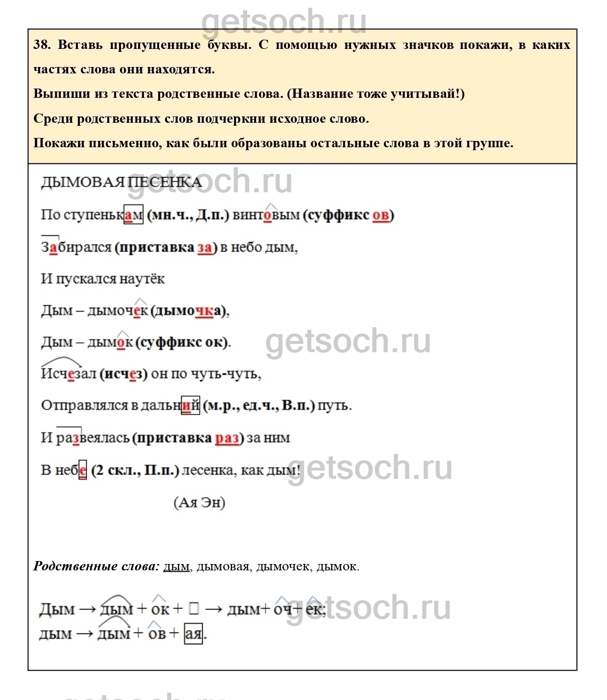 38. Вставь пропущенные буквы. С помощью нужных значков покажи, в каких частях слова они находятся.