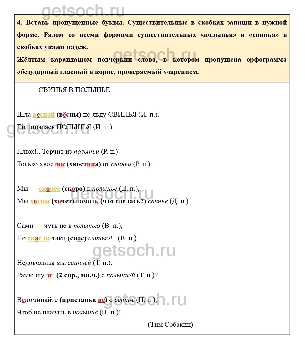 4. Вставь пропущенные буквы. Существительные в скобках запиши в нужной форме. Рядом со всеми формами существительных «полынья» и «свинья» в скобках укажи падеж.