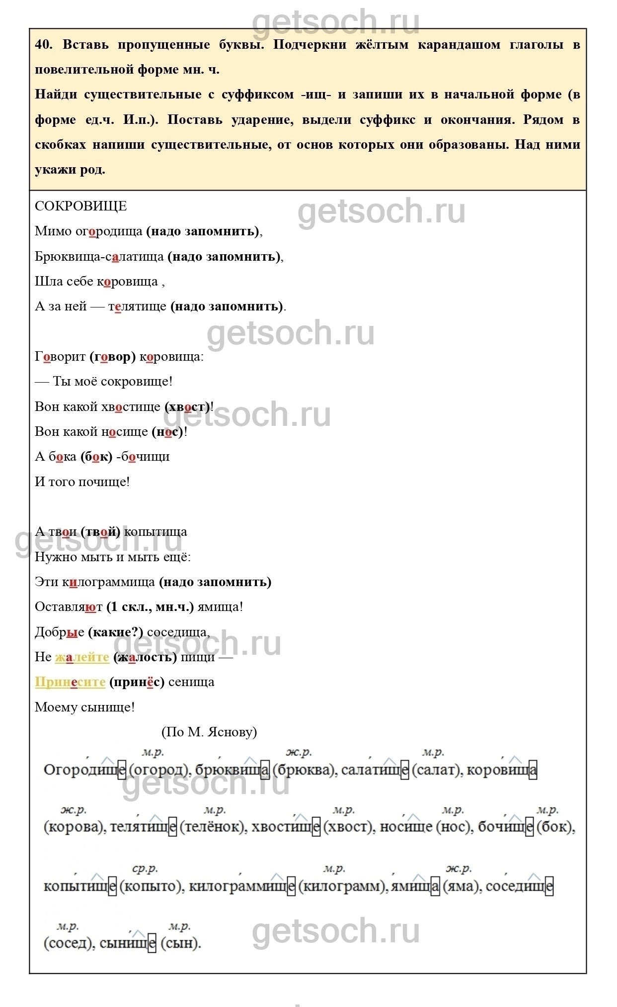 Найди существительные с суффиксом -ищ- и запиши их в начальной форме (в форме ед.ч. И.п.). Поставь ударение, выдели суффикс и окончания. Рядом в скобках напиши существительные, от основ которых они образованы. Над ними укажи род.