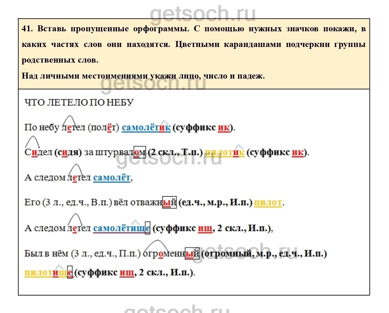 41. Вставь пропущенные орфограммы. С помощью нужных значков покажи, в каких частях слов они находятся. Цветными карандашами подчеркни группы родственных слов.