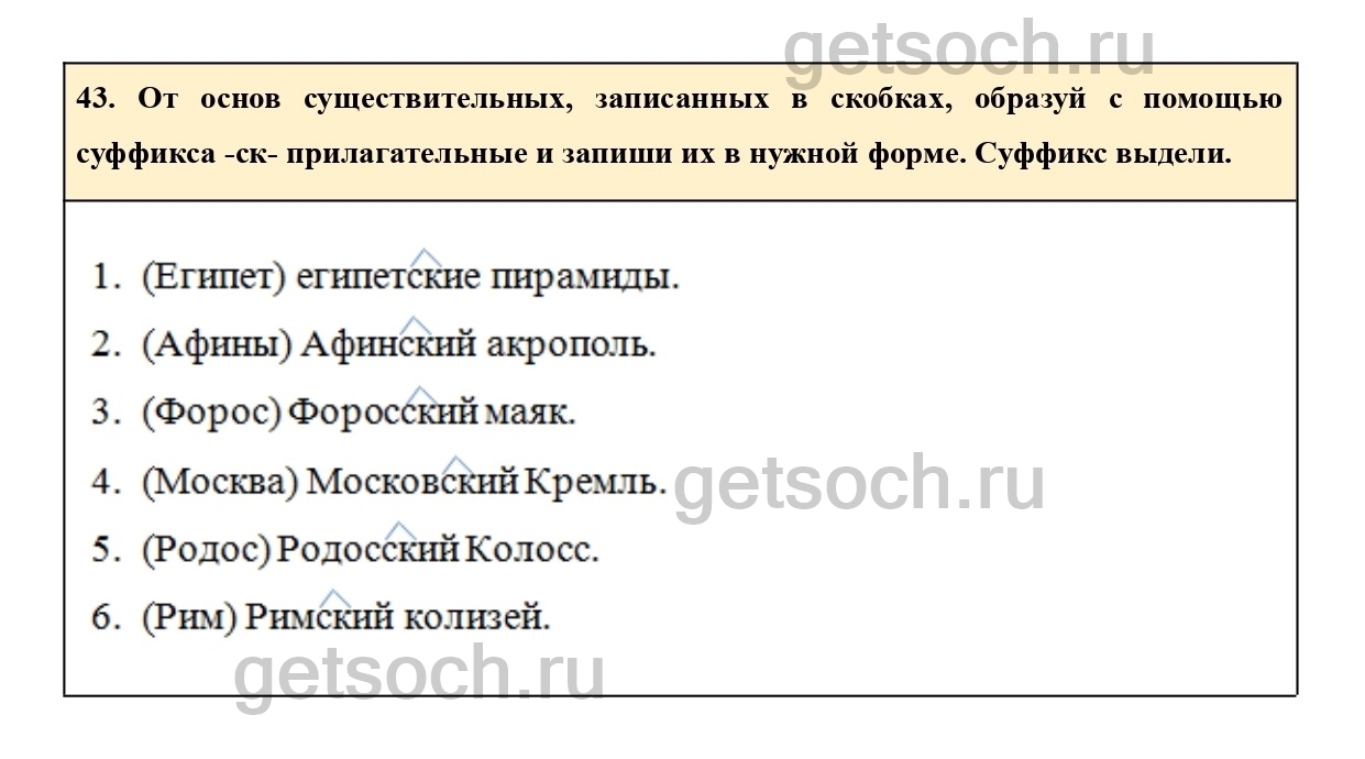 Рассмотрим ответы на Упражнение 43 из тетради для самостоятельной работы по русскому языку для 4 класса Байковой