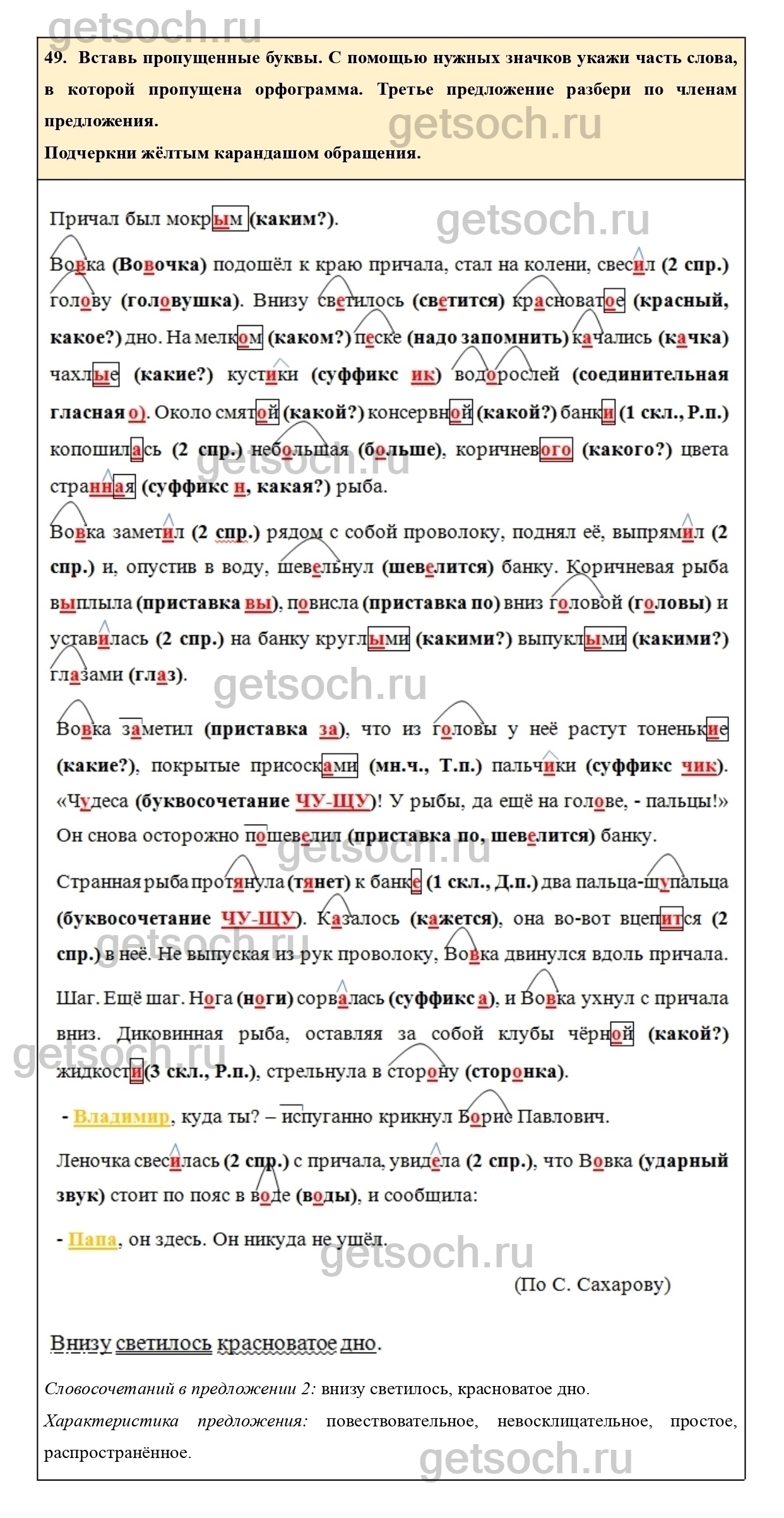 49. Вставь пропущенные буквы. С помощью нужных значков укажи часть слова, в которой пропущена орфограмма. Третье предложение разбери по членам предложения.