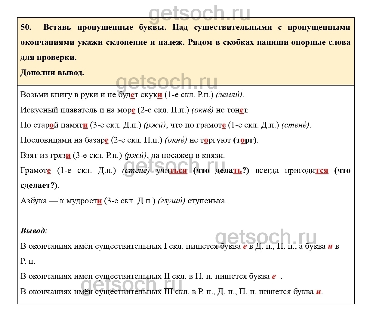 50. Вставь пропущенные буквы. Над существительными с пропущенными окончаниями укажи склонение и падеж. Рядом в скобках напиши опорные слова для проверки.