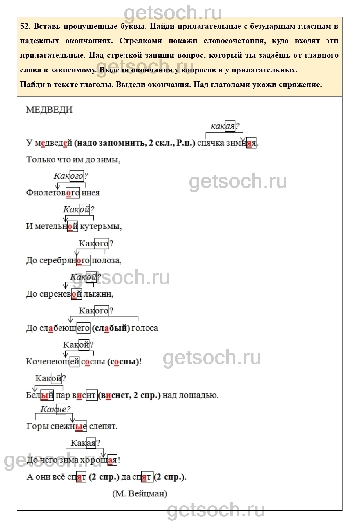 52. Вставь пропущенные буквы. Найди прилагательные с безударным гласным в падежных окончаниях. Стрелками покажи словосочетания, куда входят эти прилагательные. Над стрелкой запиши вопрос, который ты задаёшь от главного слова к зависимому. Выдели окончания у вопросов и у прилагательных.
