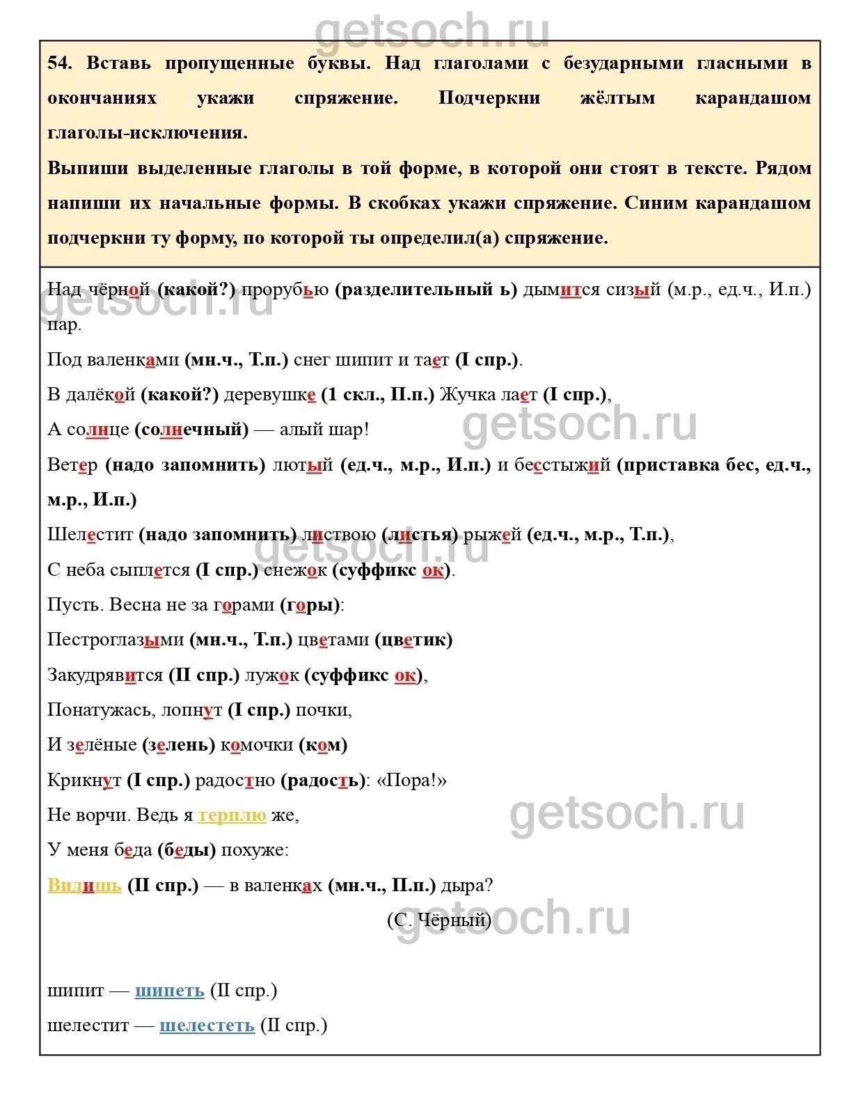 54. Вставь пропущенные буквы. Над глаголами с безударными гласными в окончаниях укажи спряжение. Подчеркни жёлтым карандашом глаголы-исключения.