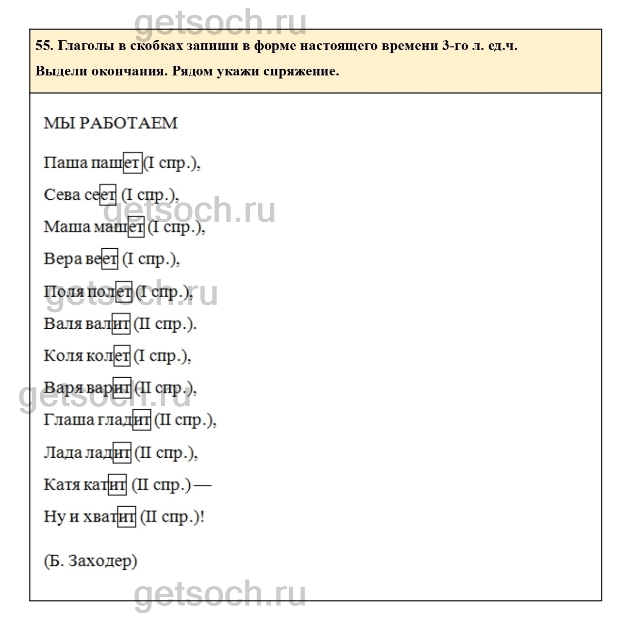 Рассмотрим ответы на Упражнение 55 из тетради для самостоятельной работы по русскому языку для 4 класса Байковой