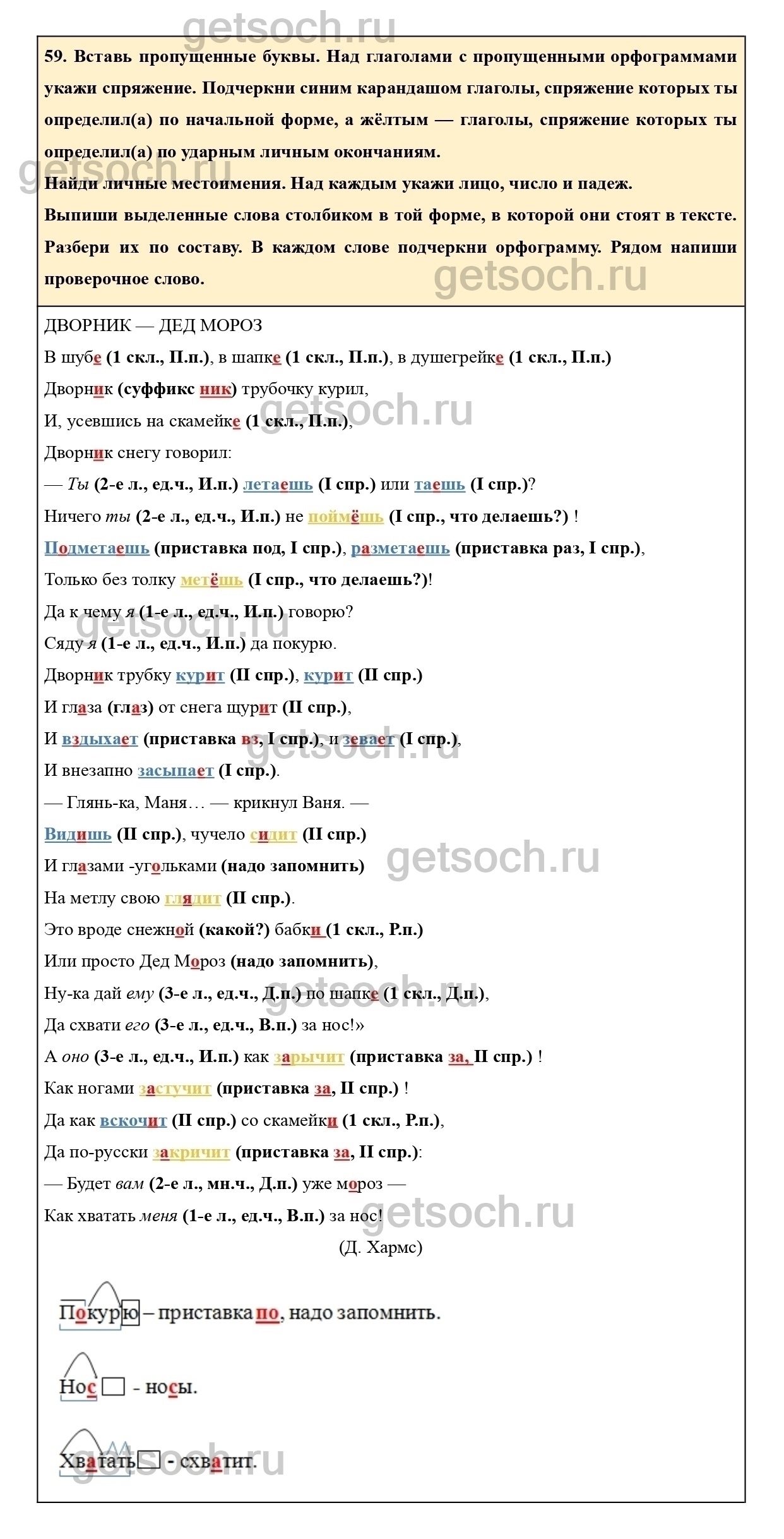 59. Вставь пропущенные буквы. Над глаголами с пропущенными орфограммами укажи спряжение. Подчеркни синим карандашом глаголы, спряжение которых ты определил(а) по начальной форме, а жёлтым — глаголы, спряжение которых ты определил(а) по ударным личным окончаниям.