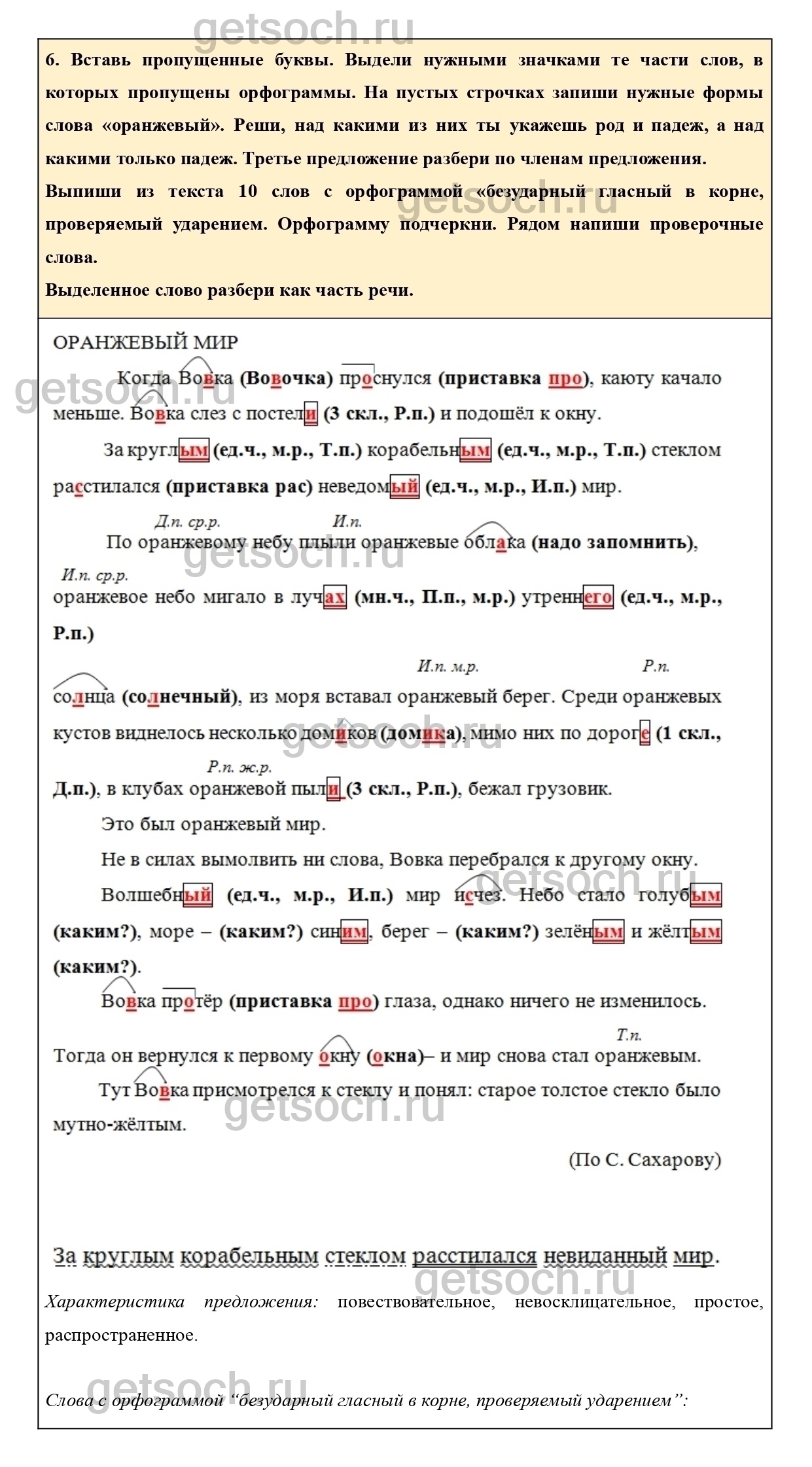 6. Вставь пропущенные буквы. Выдели нужными значками те части слов, в которых пропущены орфограммы. На пустых строчках запиши нужные формы слова «оранжевый». Реши, над какими из них ты укажешь род и падеж, а над какими только падеж. Третье предложение разбери по членам предложения.