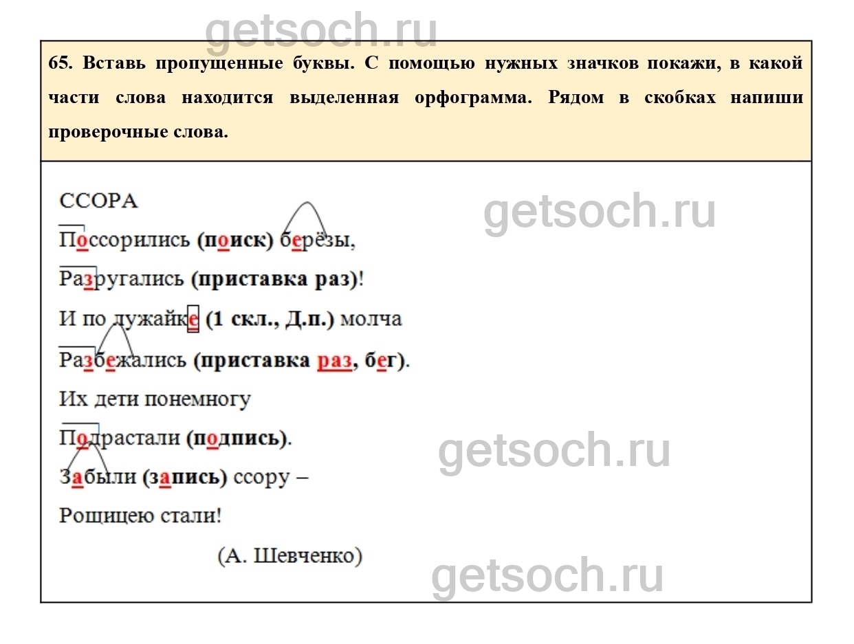 Рассмотрим ответы на Упражнение 65 из тетради для самостоятельной работы по русскому языку для 4 класса Байковой