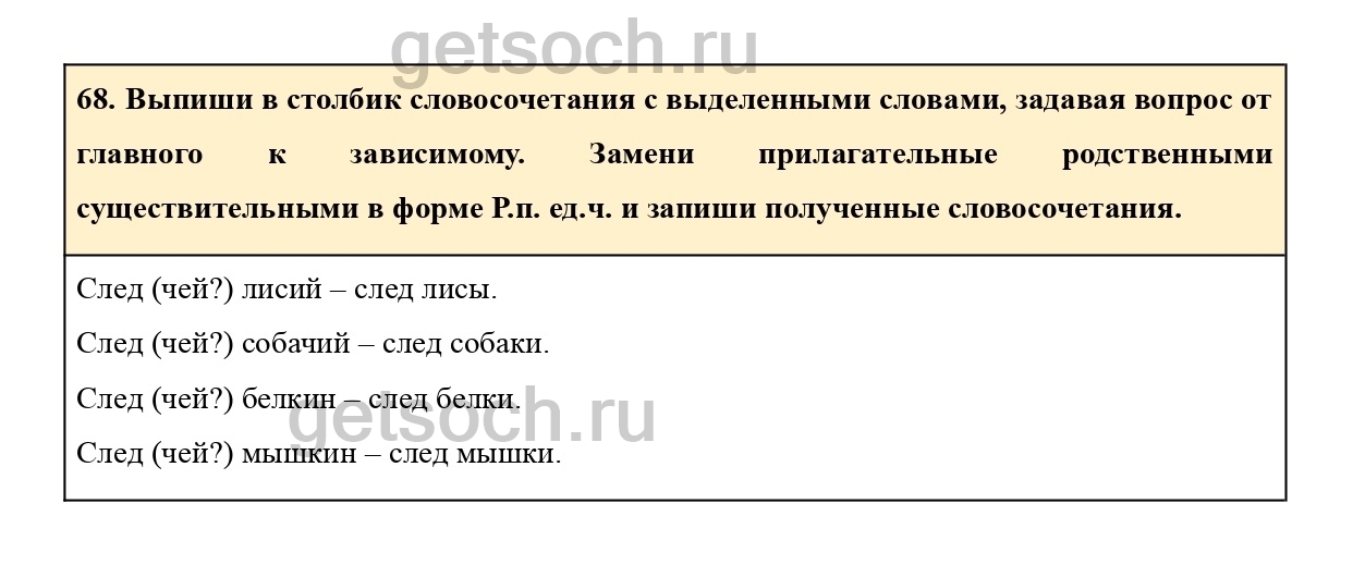 68. Выпиши в столбик словосочетания с выделенными словами, задавая вопрос от главного к зависимому. Замени прилагательные родственными существительными в форме Р.п. ед.ч. и запиши полученные словосочетания.