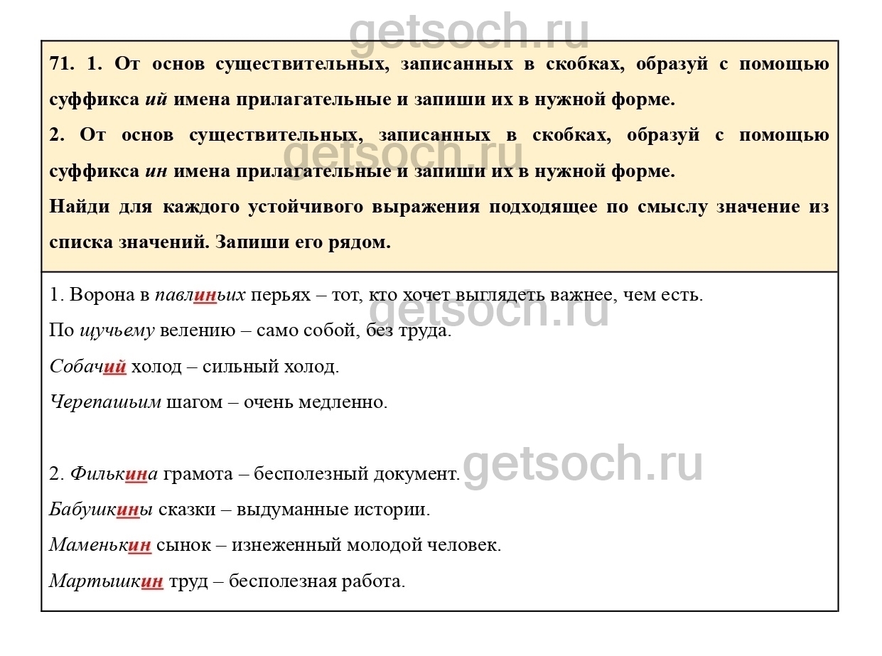 71. 1. От основ существительных, записанных в скобках, образуй с помощью суффикса ий имена прилагательные и запиши их в нужной форме.