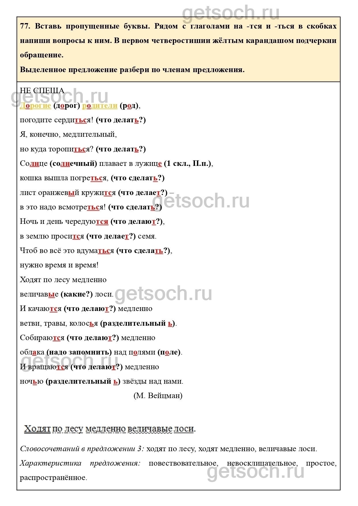 77. Вставь пропущенные буквы. Рядом с глаголами на -тся и -ться в скобках напиши вопросы к ним. В первом четверостишии жёлтым карандашом подчеркни обращение.