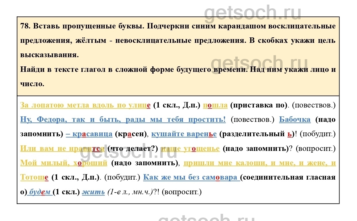 78. Вставь пропущенные буквы. Подчеркни синим карандашом восклицательные предложения, жёлтым – невосклицательные предложения. В скобках укажи цель высказывания.