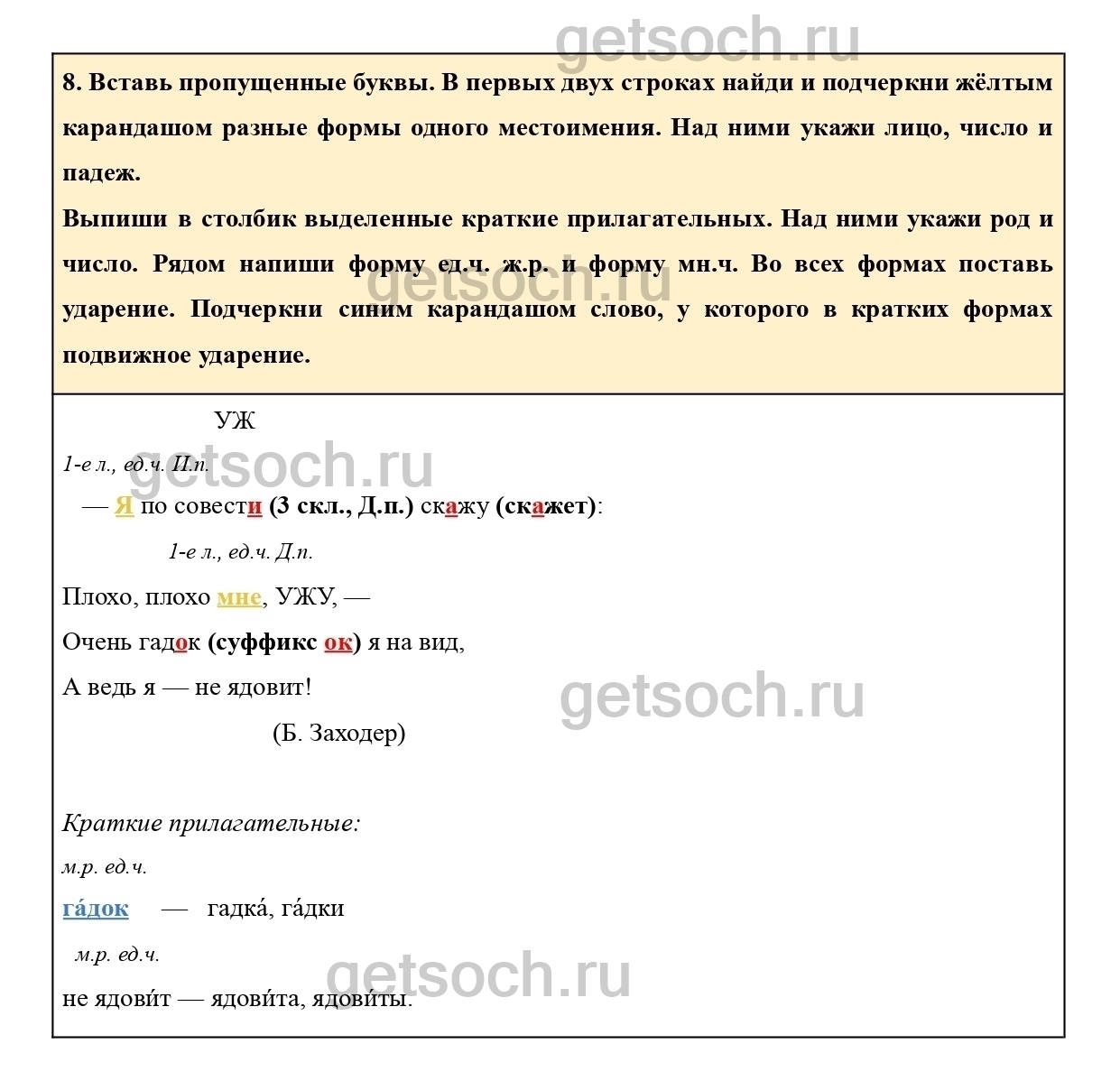 8. Вставь пропущенные буквы. В первых двух строках найди и подчеркни жёлтым карандашом разные формы одного местоимения. Над ними укажи лицо, число и падеж.