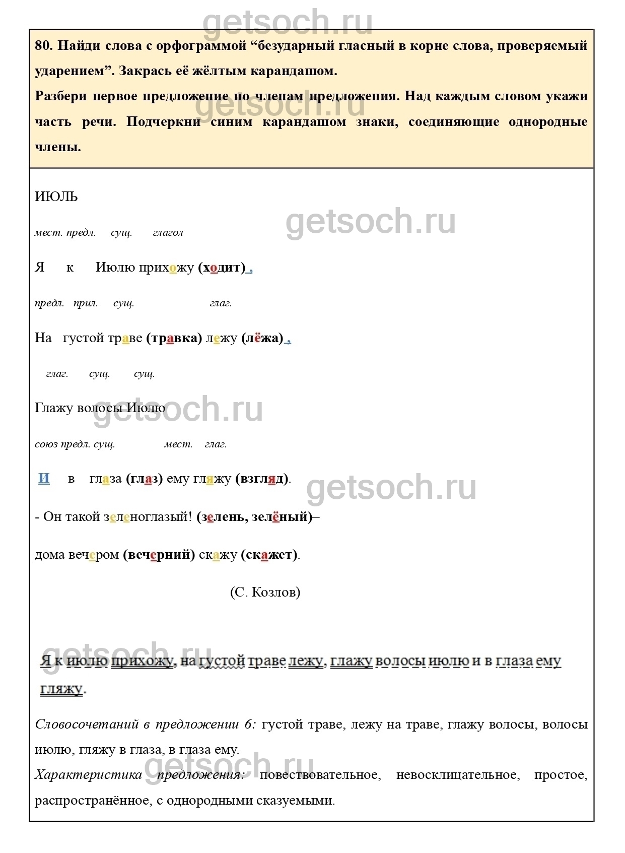 80. Найди слова с орфограммой “безударный гласный в корне слова, проверяемый ударением”. Закрась её жёлтым карандашом.