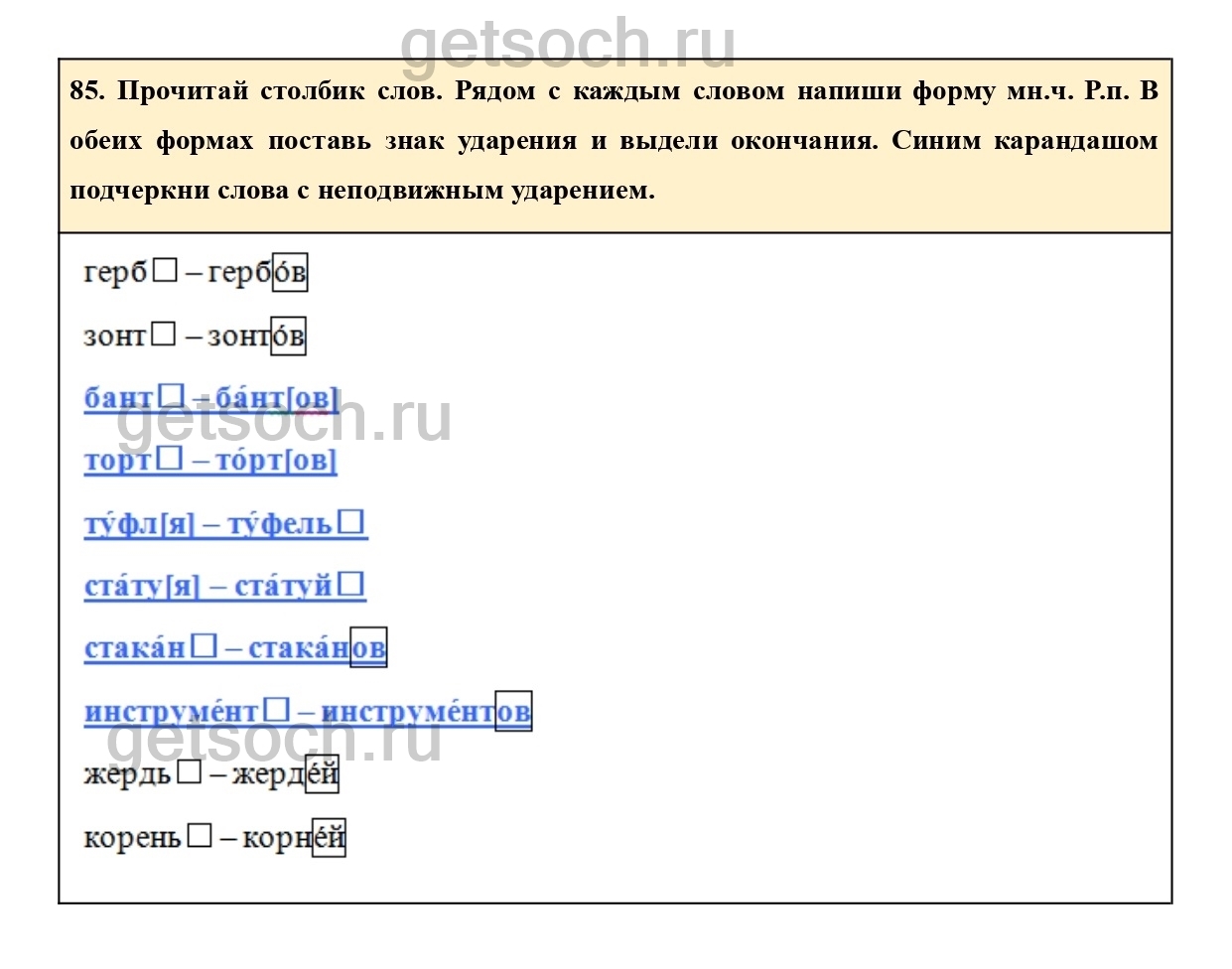85. Прочитай столбик слов. Рядом с каждым словом напиши форму мн.ч. Р.п. В обеих формах поставь знак ударения и выдели окончания. Синим карандашом подчеркни слова с неподвижным ударением.