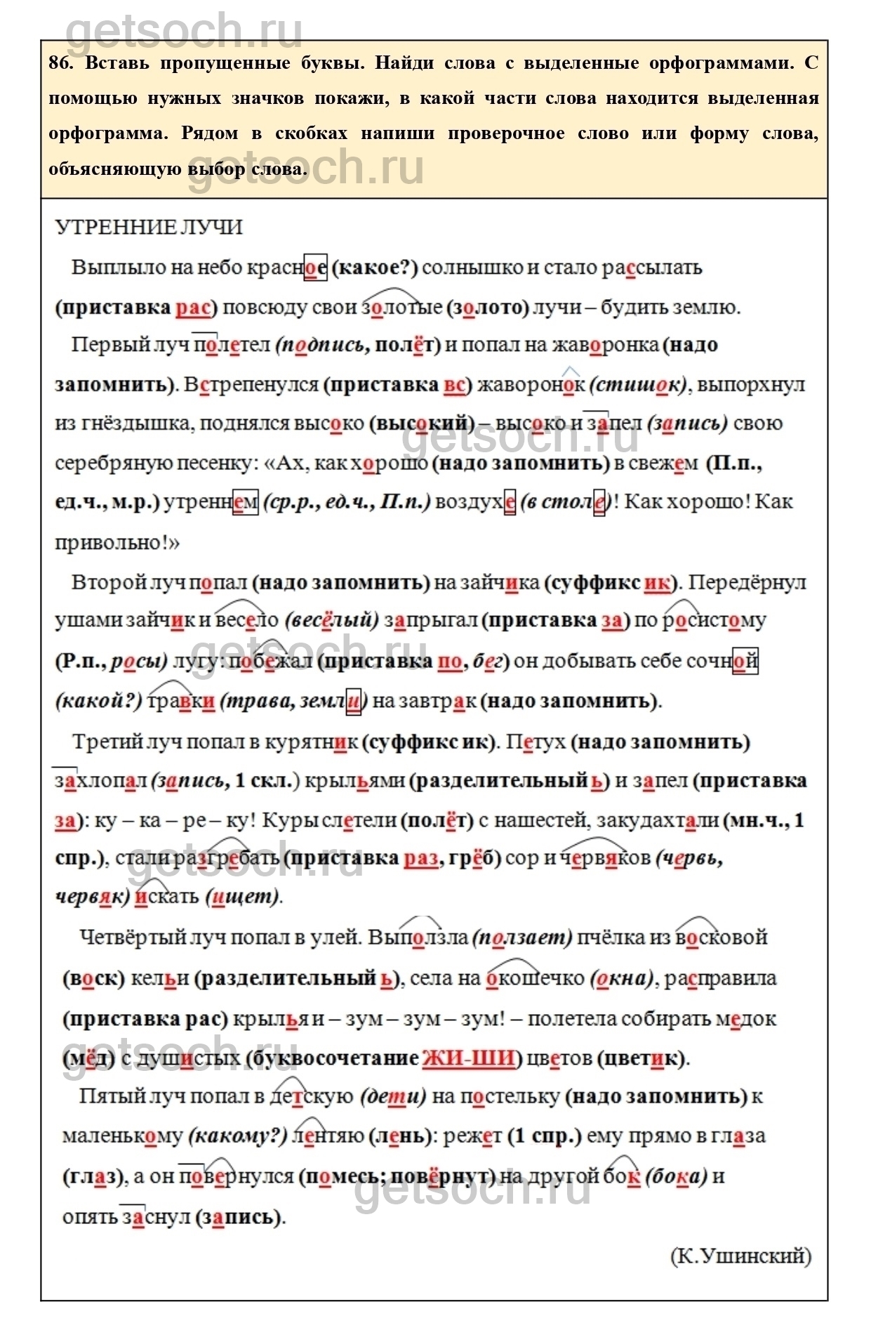 86. Вставь пропущенные буквы. Найди слова с выделенные орфограммами. С помощью нужных значков покажи, в какой части слова находится выделенная орфограмма. Рядом в скобках напиши проверочное слово или форму слова, объясняющую выбор слова.