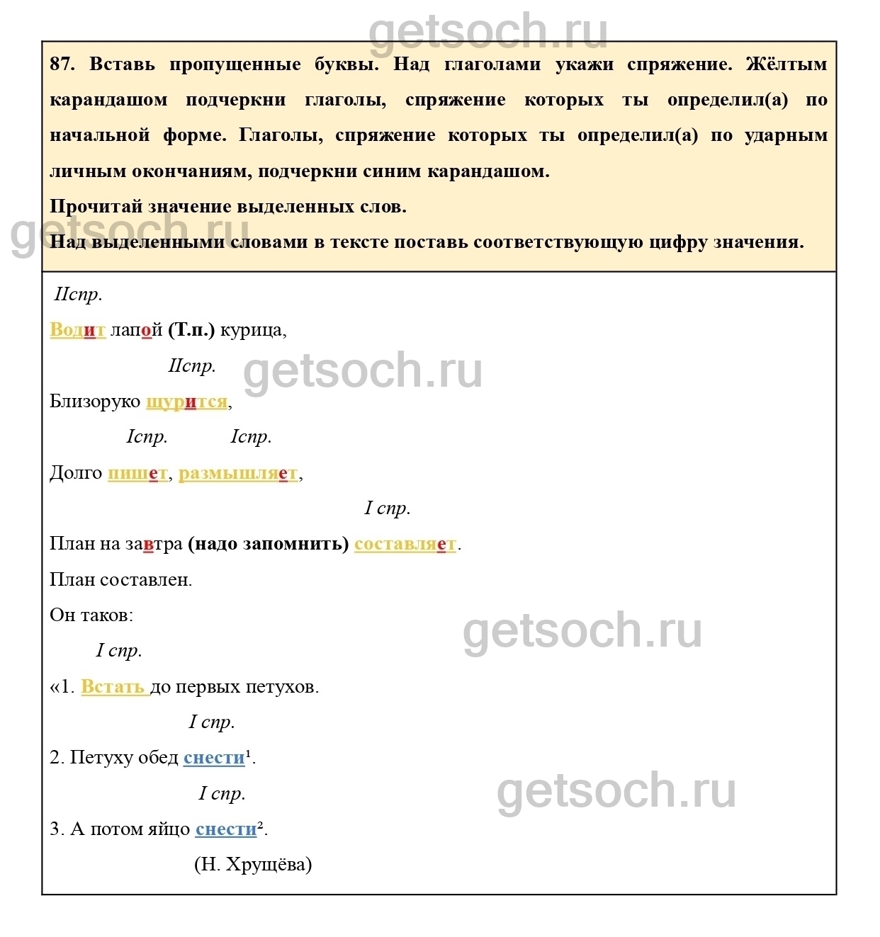 87. Вставь пропущенные буквы. Над глаголами укажи спряжение. Жёлтым карандашом подчеркни глаголы, спряжение которых ты определил(а) по начальной форме. Глаголы, спряжение которых ты определил(а) по ударным личным окончаниям, подчеркни синим карандашом.
