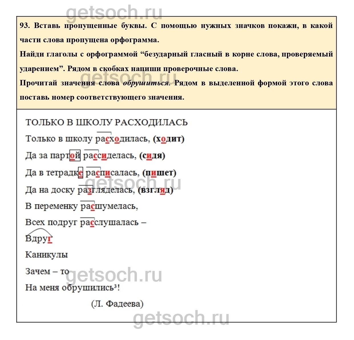 93. Вставь пропущенные буквы. С помощью нужных значков покажи, в какой части слова пропущена орфограмма.