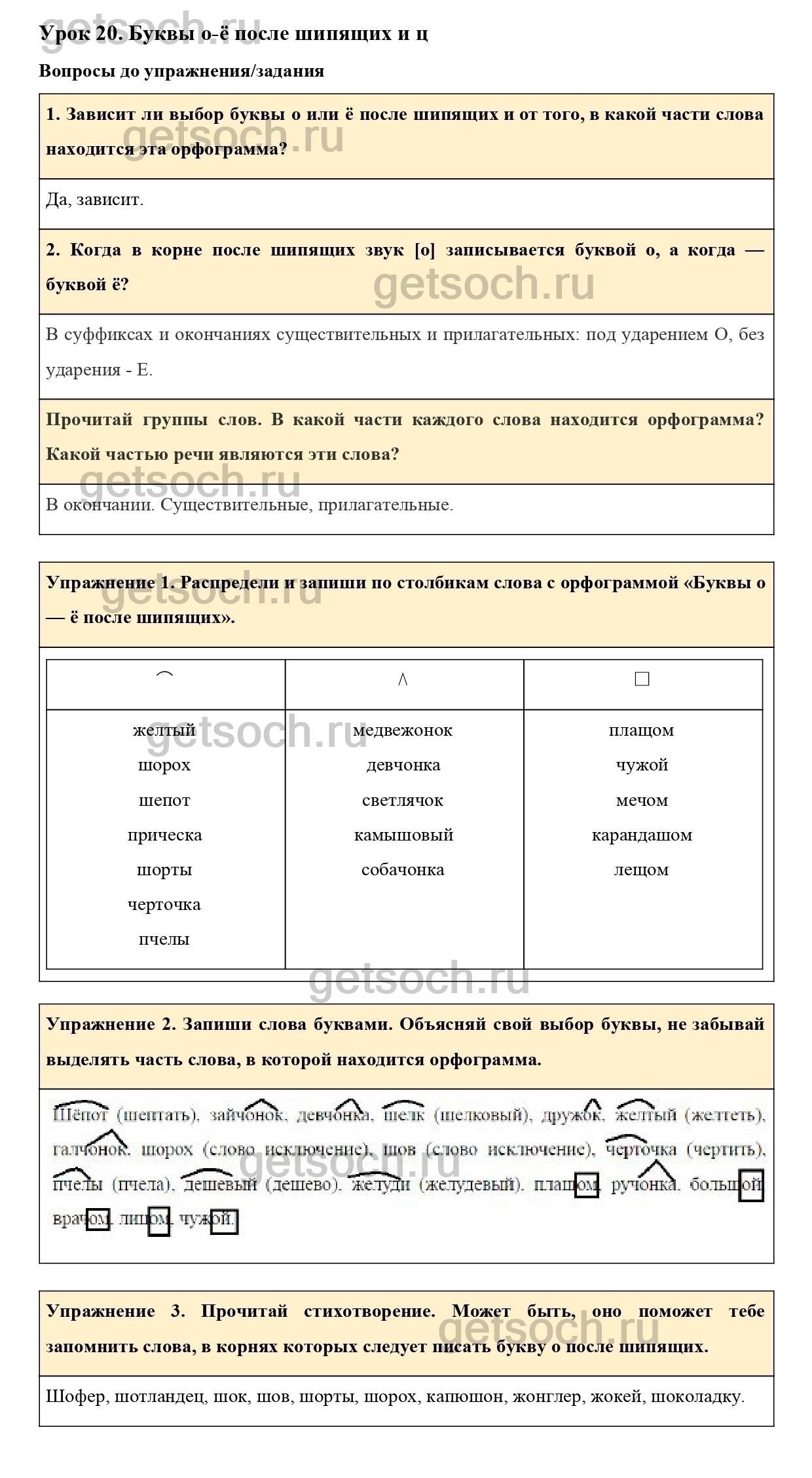 Упражнение 3. Прочитай стихотворение. Может быть, оно поможет тебе запомнить слова, в корнях которых следует писать букву о после шипящих.