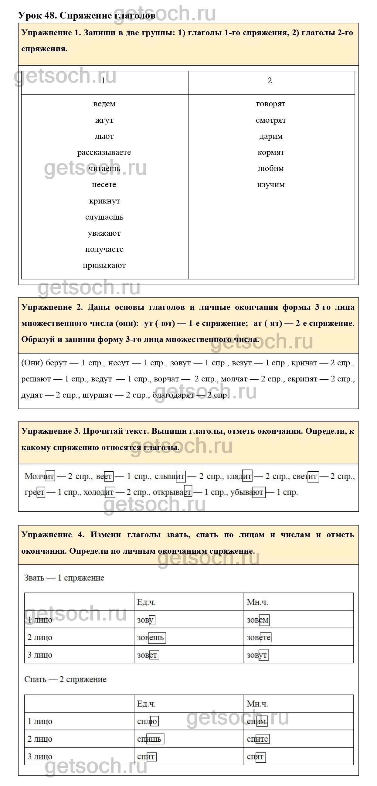 Упражнение 4. Измени глаголы звать, спать по лицам и числам и отметь окончания. Определи по личным окончаниям спряжение.