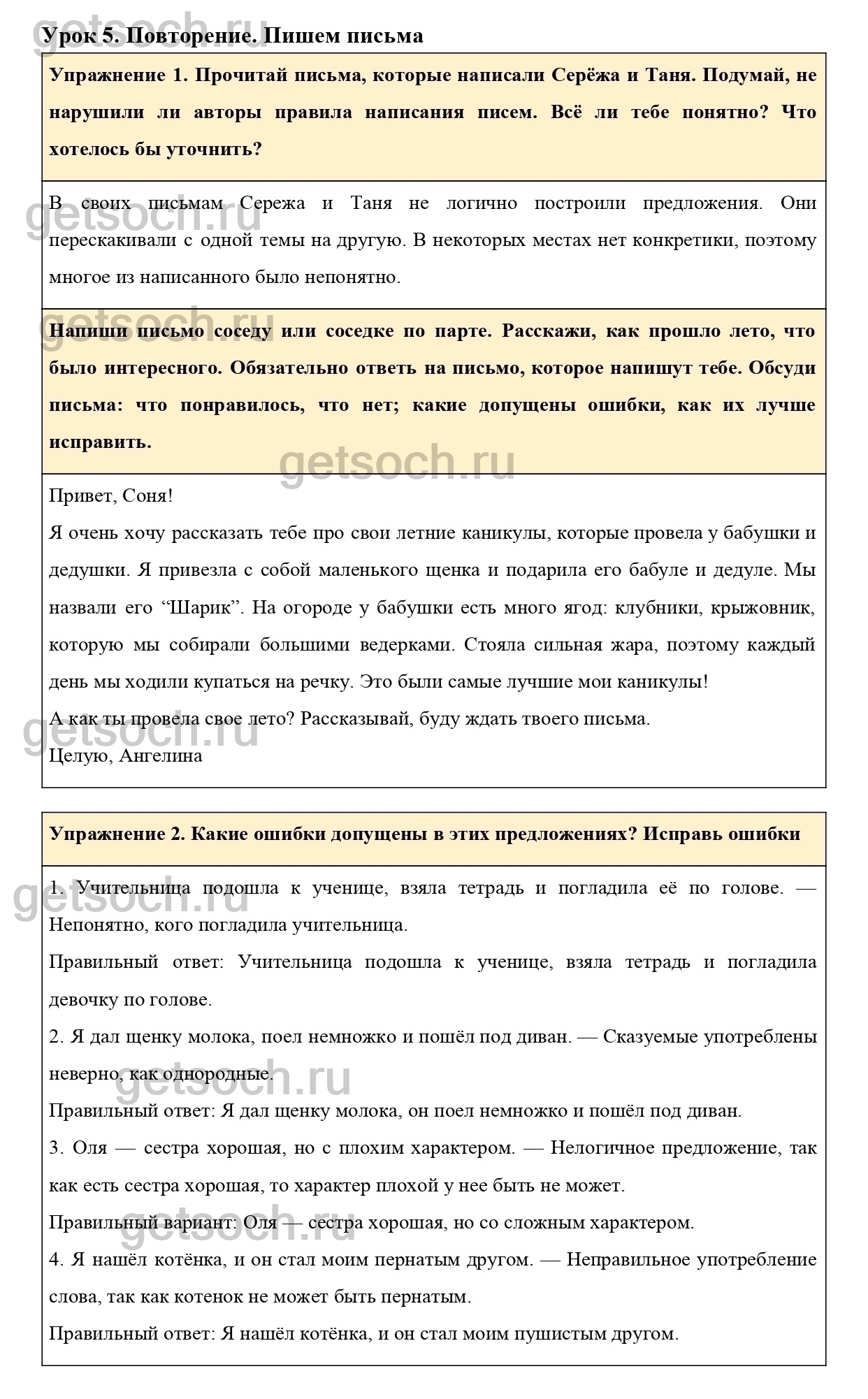 Упражнение 1. Прочитай письма, которые написали Серёжа и Таня. Подумай, не нарушили ли авторы правила написания писем. Всё ли тебе понятно? Что хотелось бы уточнить?