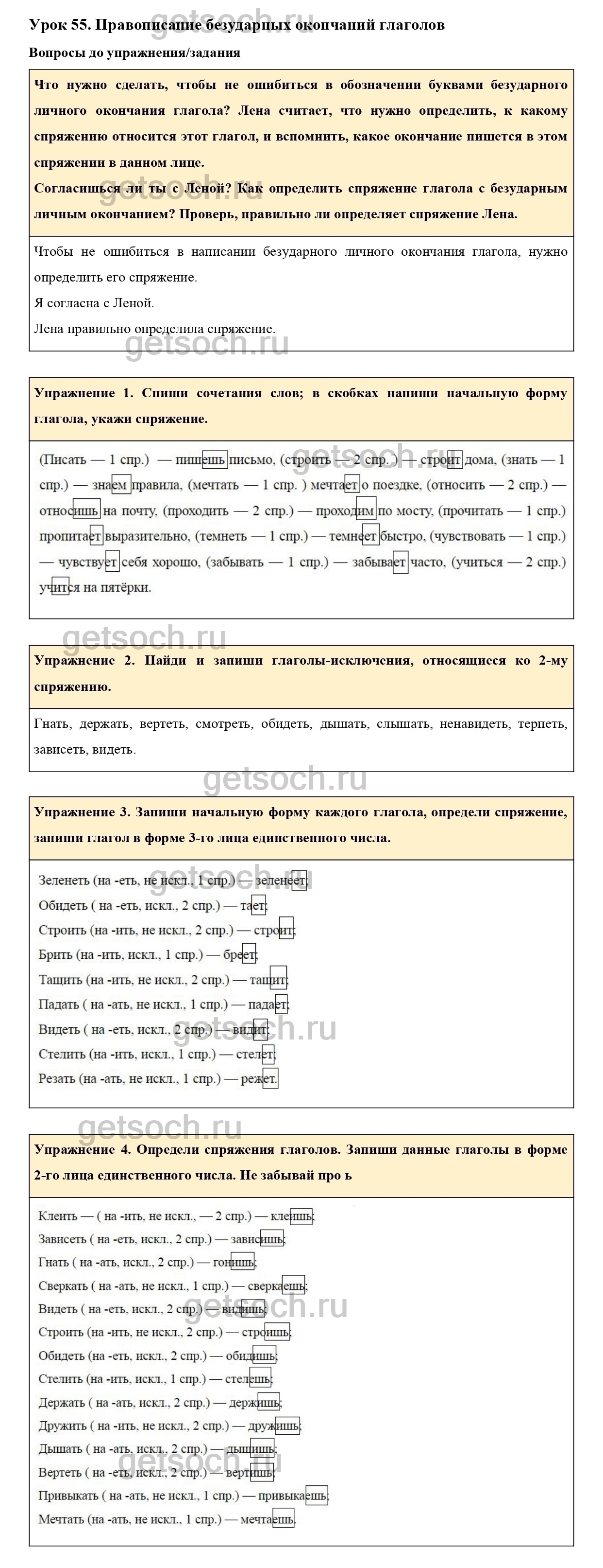 Рассмотрим ответы на Урок 55 из учебника по русскому языку для 4 класса Иванова