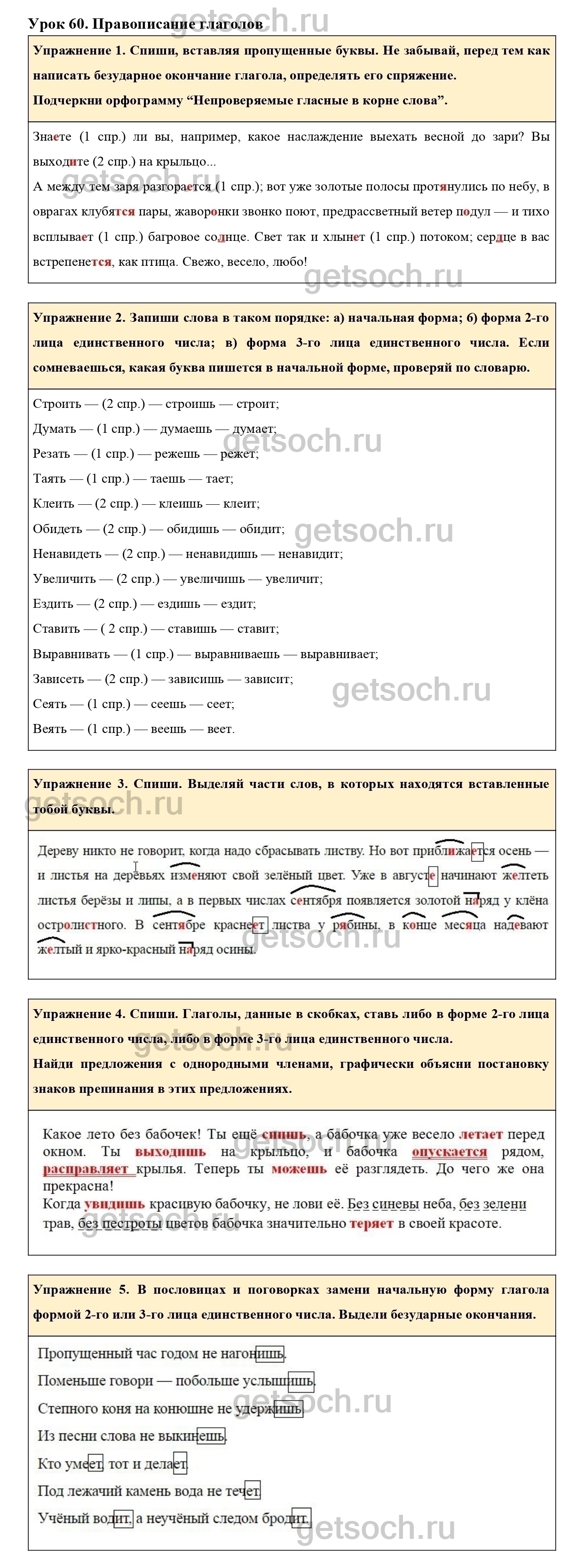 Рассмотрим ответы на Урок 60 из учебника по русскому языку для 4 класса Иванова