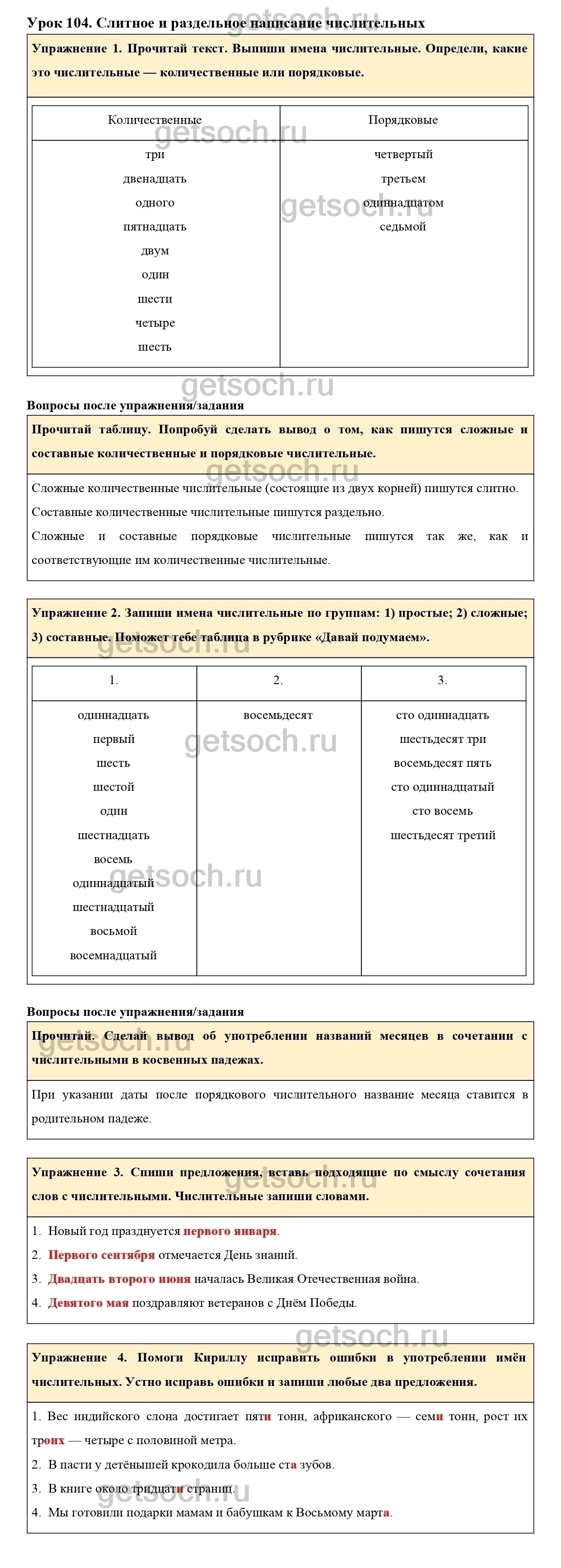 Рассмотрим ответы на Урок 104 из учебника по русскому языку для 4 класса Иванова