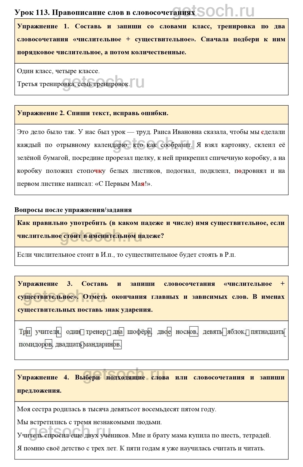 Рассмотрим ответы на Урок 113 из учебника по русскому языку для 4 класса Иванова