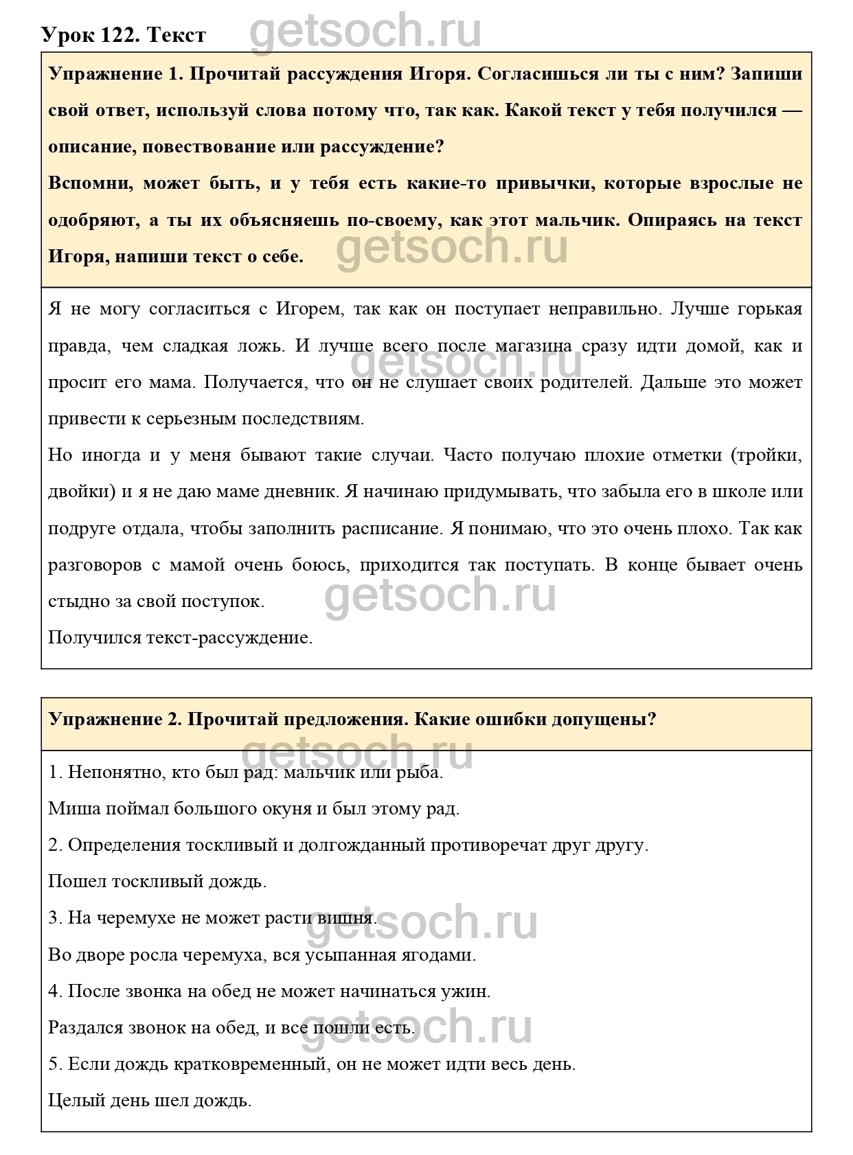 “Упражнение 1. Прочитай рассуждения Игоря. Согласишься ли ты с ним? Запиши свой ответ, используй слова потому что, так как. Какой текст у тебя получился — описание, повествование или рассуждение?