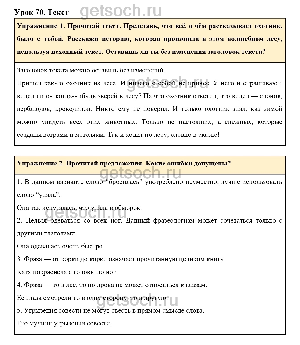 Рассмотрим ответы на Урок 70 из учебника по русскому языку для 4 класса Иванова