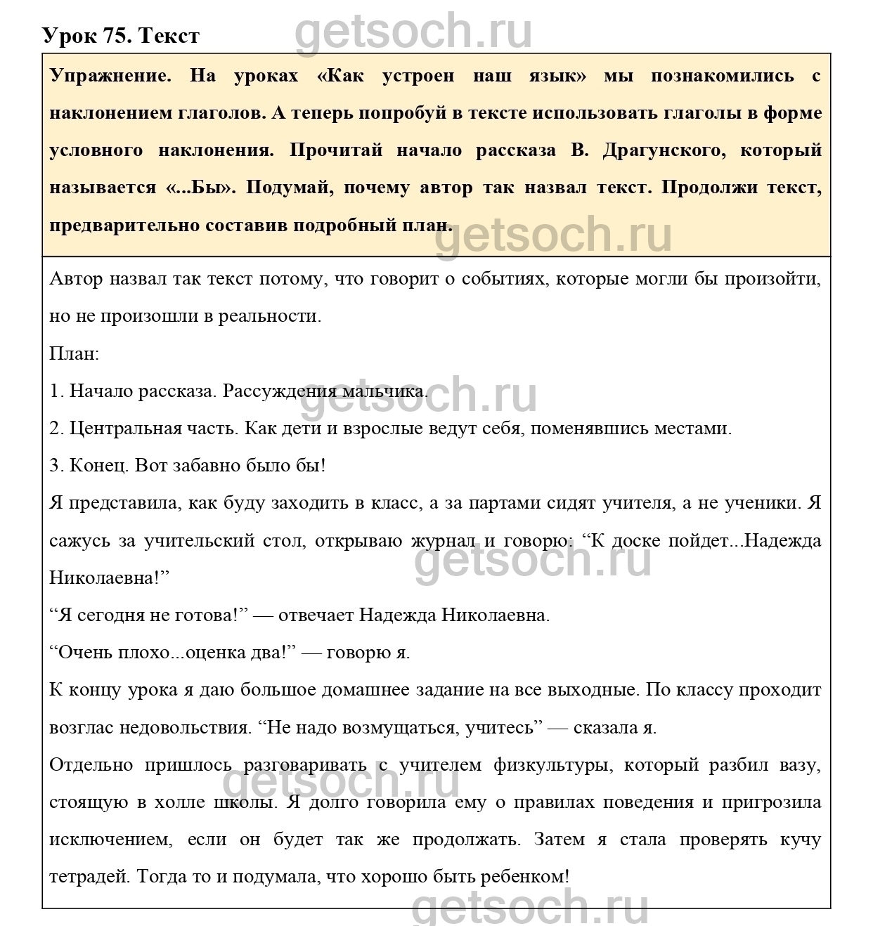 Упражнение. На уроках «Как устроен наш язык» мы познакомились с наклонением глаголов. А теперь попробуй в тексте использовать глаголы в форме условного наклонения. Прочитай начало рассказа В. Драгунского, который называется «…Бы». Подумай, почему автор так назвал текст. Продолжи текст, предварительно составив подробный план.