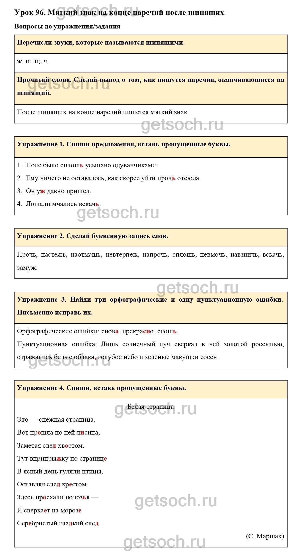 Прочитай слова. Сделай вывод о том, как пишутся наречия, оканчивающиеся на шипящий.