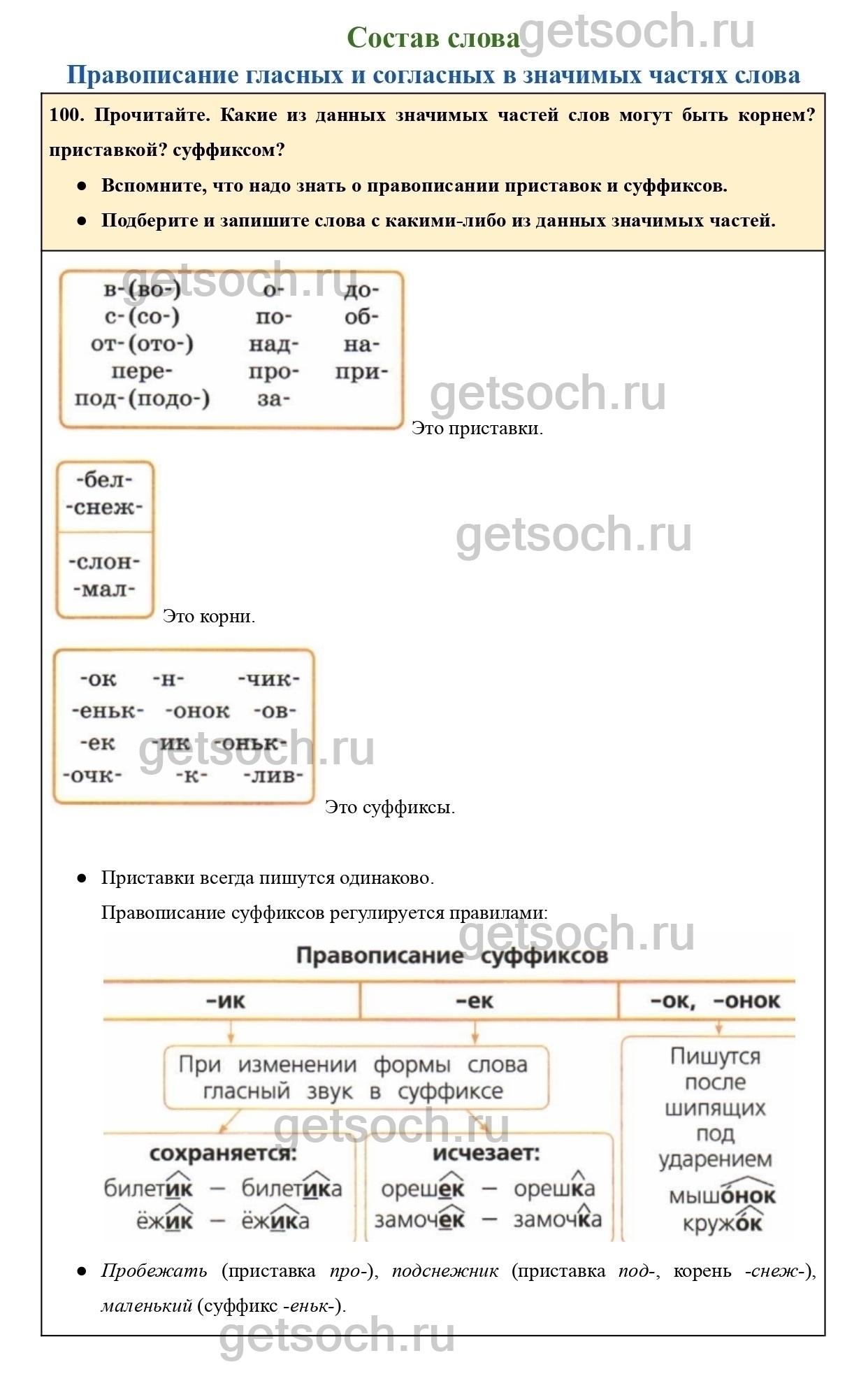 100. Прочитайте. Какие из данных значимых частей слов могут быть корнем? приставкой? суффиксом?