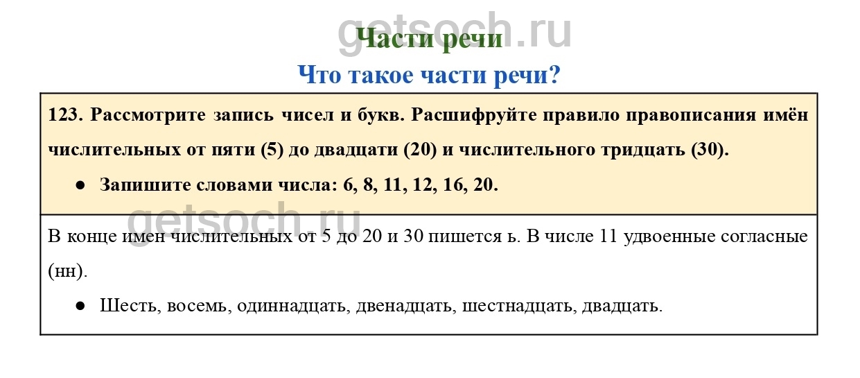 123. Рассмотрите запись чисел и букв. Расшифруйте правило правописания имён числительных от пяти (5) до двадцати (20) и числительного тридцать (30).