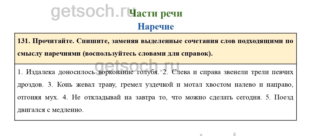 131. Прочитайте. Спишите, заменяя выделенные сочетания слов подходящими по смыслу наречиями (воспользуйтесь словами для справок).