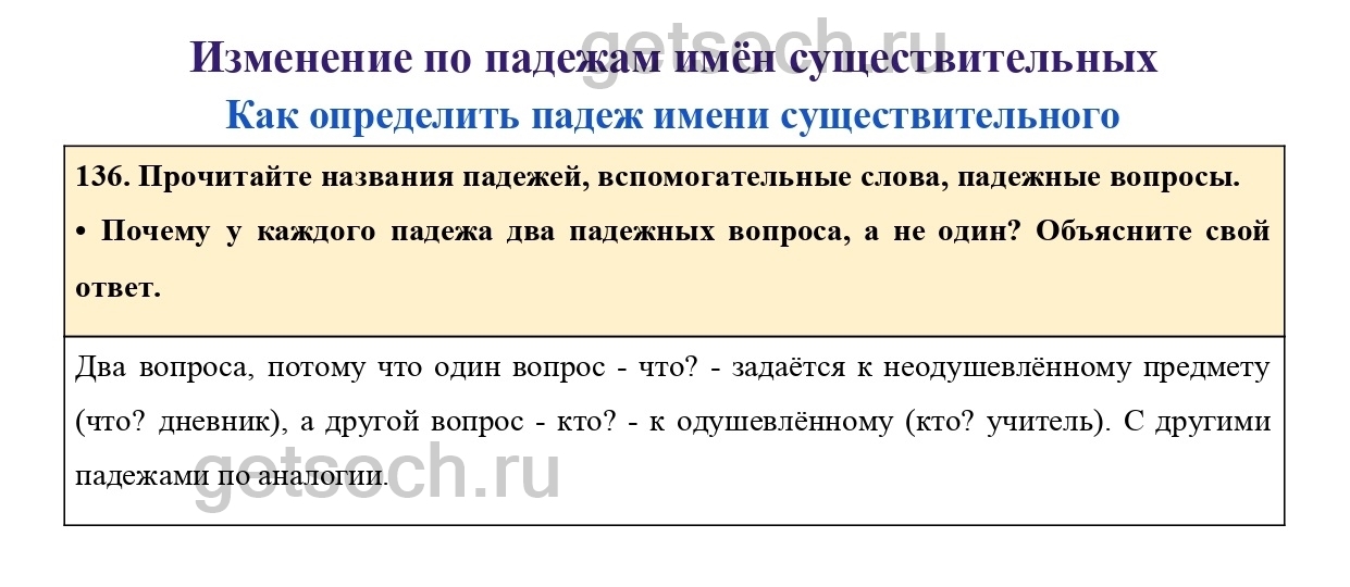 136. Прочитайте названия падежей, вспомогательные слова, падежные вопросы.