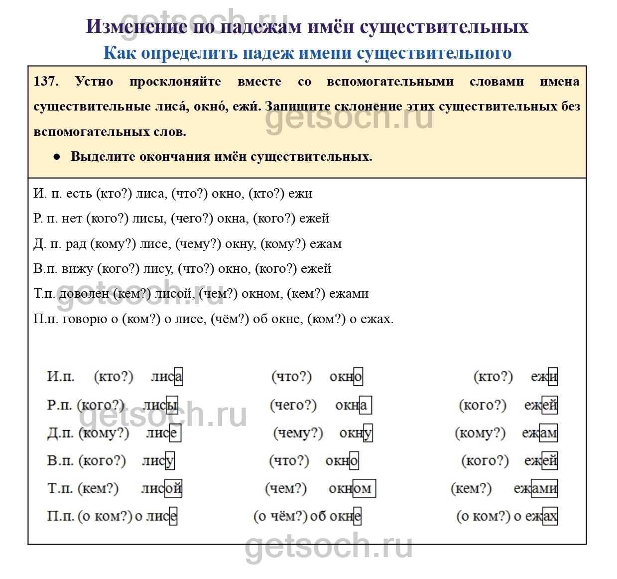 137. Устно просклоняйте вместе со вспомогательными словами имена существительные лиса́, окно́, ежи́. Запишите склонение этих существительных без вспомогательных слов.