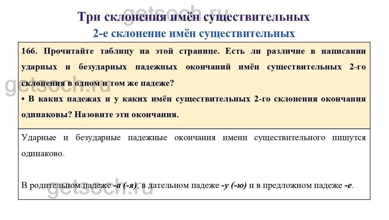 166. Прочитайте таблицу на этой странице. Есть ли различие в написании ударных и безударных падежных окончаний имён существительных 2-го склонения в одном и том же падеже?