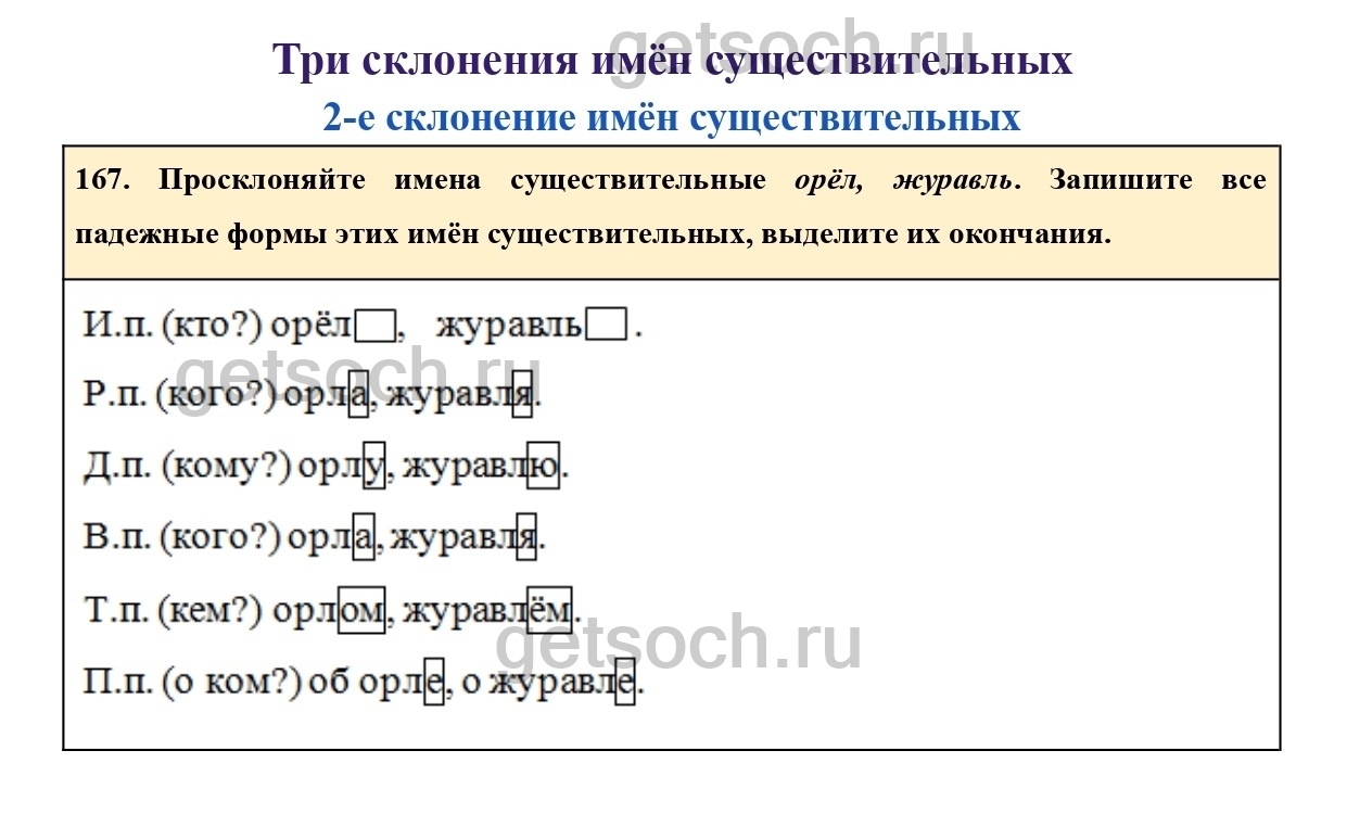 167. Просклоняйте имена существительные орёл, журавль. Запишите все падежные формы этих имён существительных, выделите их окончания.