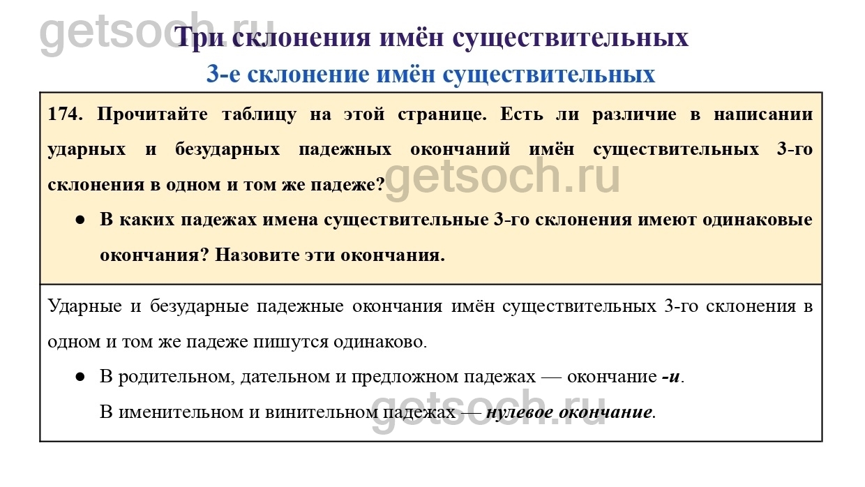 174. Прочитайте таблицу на этой странице. Есть ли различие в написании ударных и безударных падежных окончаний имён существительных 3-го склонения в одном и том же падеже?