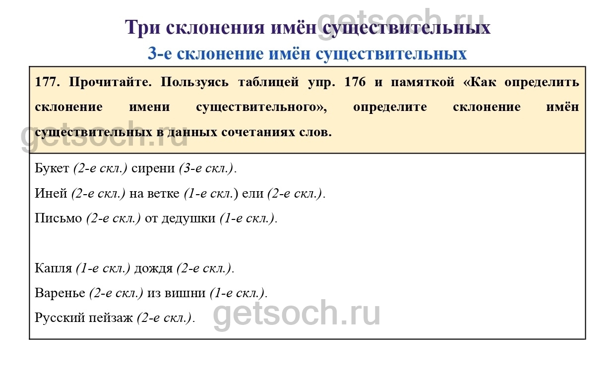 177. Прочитайте. Пользуясь таблицей упр. 176 и памяткой «Как определить склонение имени существительного», определите склонение имён существительных в данных сочетаниях слов.
