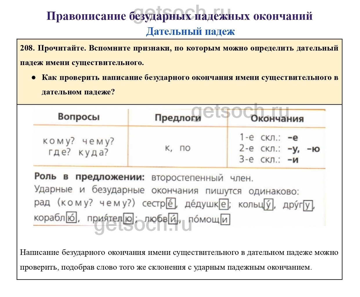 208. Прочитайте. Вспомните признаки, по которым можно определить дательный падеж имени существительного.