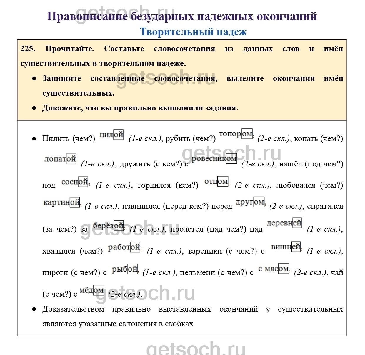 225. Прочитайте. Составьте словосочетания из данных слов и имён существительных в творительном падеже.