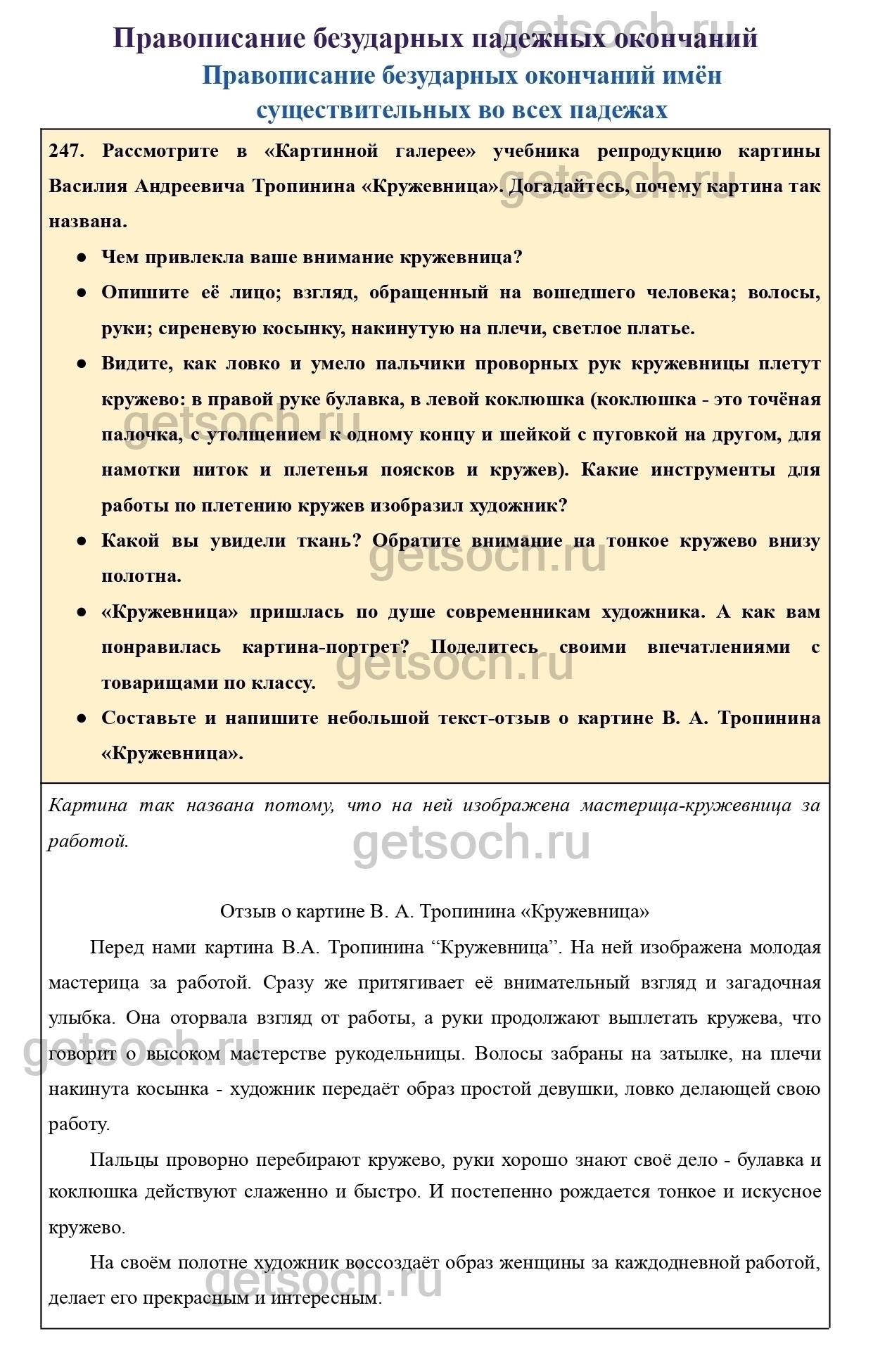247. Рассмотрите в «Картинной галерее» учебника репродукцию картины Василия Андреевича Тропинина «Кружевница». Догадайтесь, почему картина так названа.