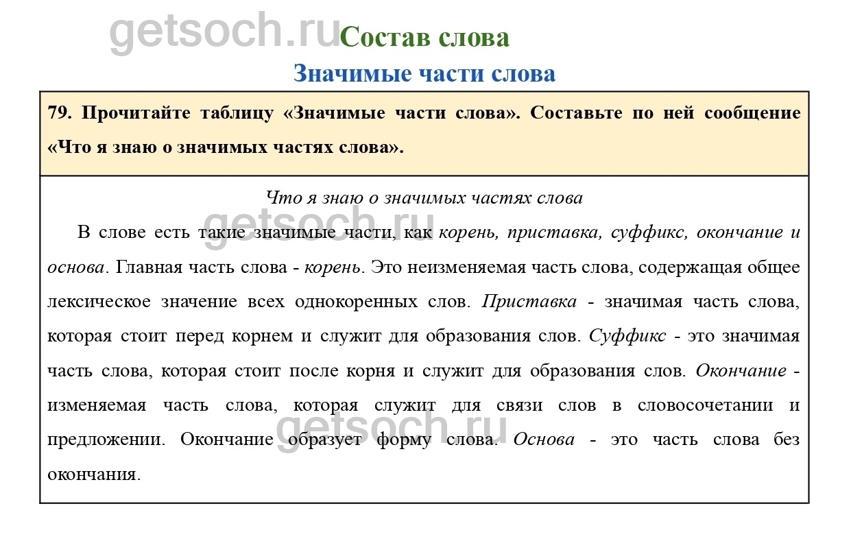 79. Прочитайте таблицу «Значимые части слова». Составьте по ней сообщение «Что я знаю о значимых частях слова».