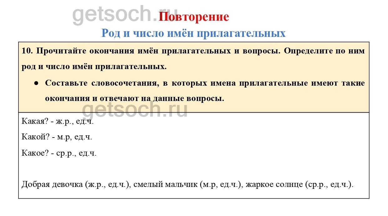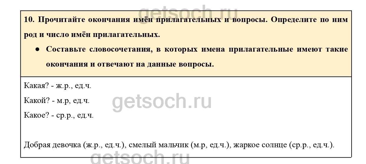 10. Прочитайте окончания имён прилагательных и вопросы. Определите по ним род и число имён прилагательных.