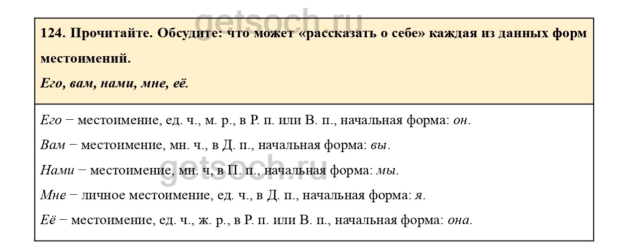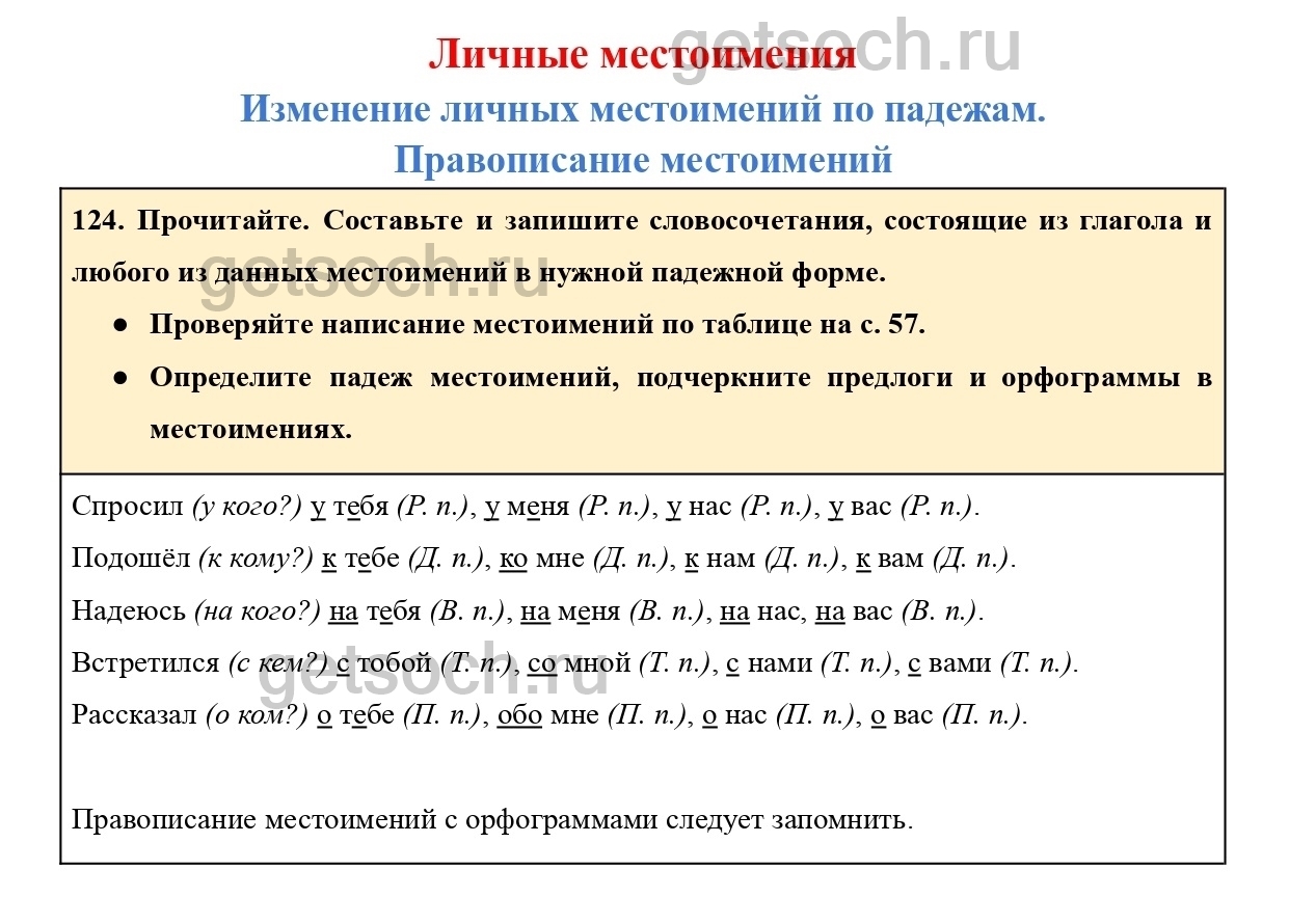 124. Прочитайте. Составьте и запишите словосочетания, состоящие из глагола и любого из данных местоимений в нужной падежной форме.